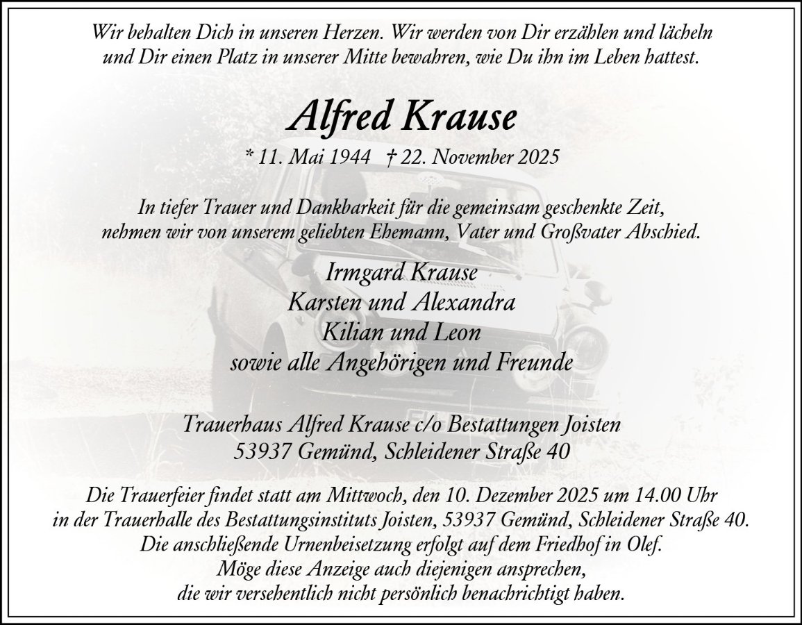 in dieser Zeit des Schmerzes wünschen wir Ihnen Kraft, den Verlust im Kreise Ihrer Liebsten zu verarbeiten. Als Zeichen unserer Anteilnahme und des Gedenkens entzünden wir dieses erste Licht. Möge diese Gedenkseite Ihnen helfen, Erinnerungen zu teilen und so das Andenken gemeinsam wachzuhalten.