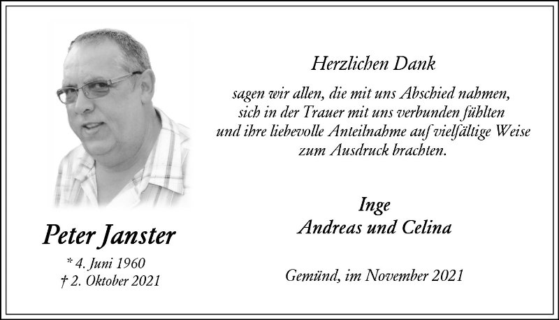 Liebe Frau Janster, lieber Andreas, unser Mitgefühl gilt Ihnen und dir. Wir wünschen viel Kraft für die nächste Zeit.