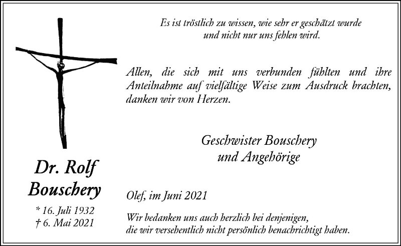 Dr. Rolf Bouscherygestorben am 6. Mai 2021